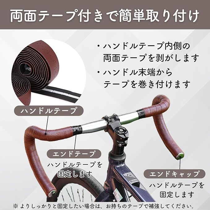 自転車のハンドル周りをドレスアップできるレザー調のバーテープです。劣化による張り替えにもどうぞ! また、両面テープ付きの2本セットのためすぐにお使いいただけます。