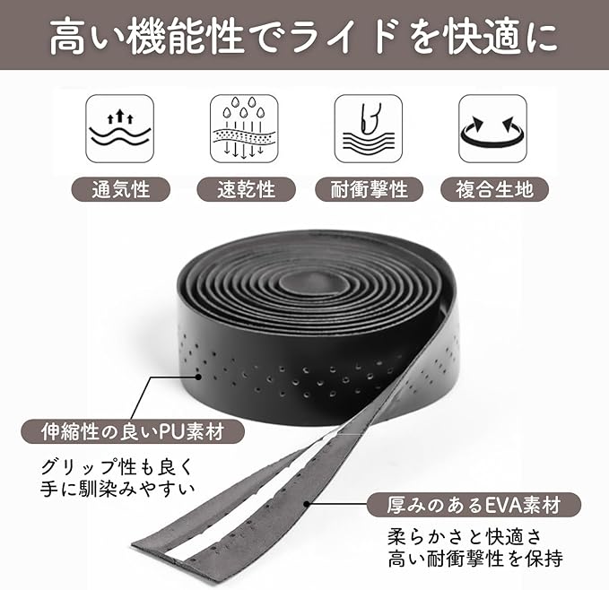 ハンドルテープに適しているEVA素材を採用!通気孔があり、手に馴染む素材感のバーテープになっています。