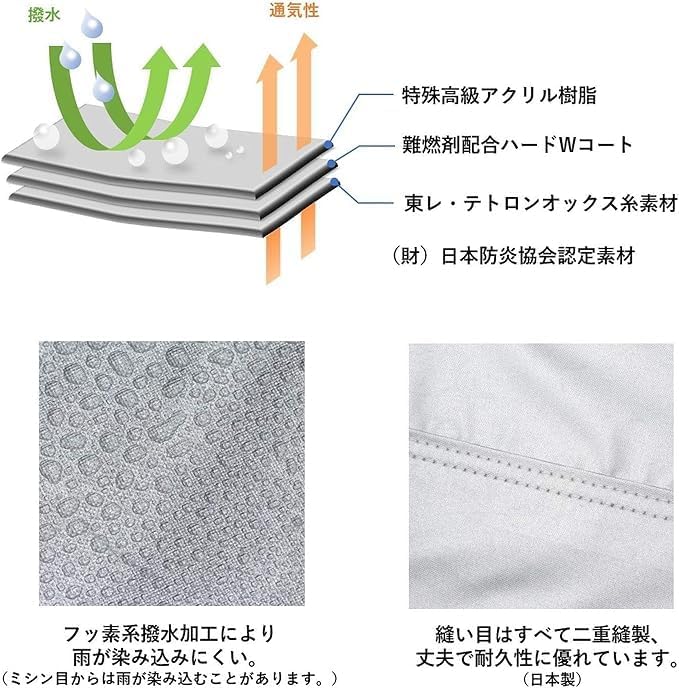 ※生地には防水加工、縫製糸には撥水加工を施してありますが、完全防水ではありませんので雨量によっては車体が濡れる場合があります。