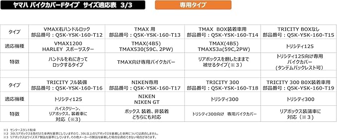 ■ヤマハ:TW(200,250)、XT250X、XTZ125E、R1-Z、YBR(125/250)、MT-25/03、MT-07/09、MT-10、XSR900、SR400(センタースタンド駐車)、トリッカー/TY-S