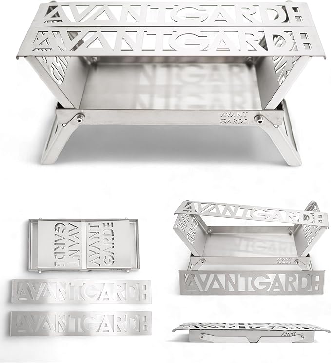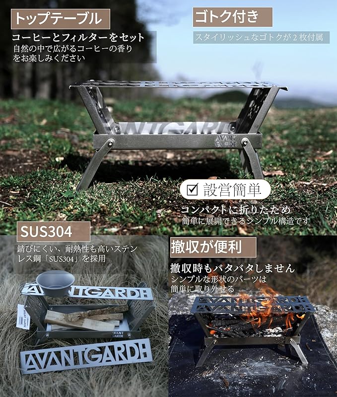 [AVANT GARDE] 焚き火台 折りたたみ ローテーブル兼用 3秒設営 超コンパクト ステンレスSUS304 厚み2mm 高耐久 錆びにくい 無骨デザイン ゴトク付き 収納袋付き 調理対応 簡単片付け 薪割り不要 ソロキャンプ ファミリー BBQ【スタイリッシュに、焚く】 | KAZESHOP