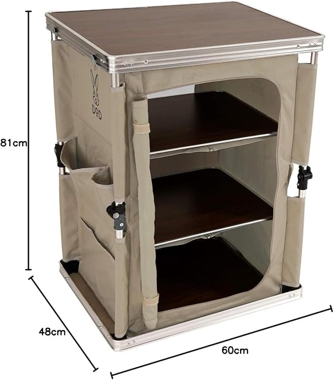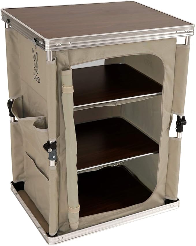 大容量な3段の棚はギアや調理道具を収納することができ、キャンプキッチンの整理整頓に役立ちます。