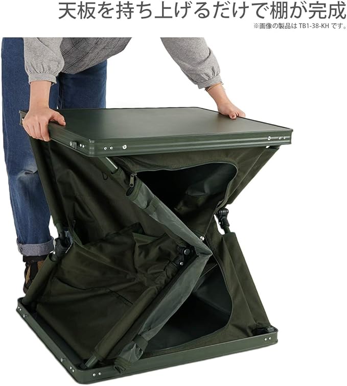 アタッシュケース型の収納状態から天板を持ち上げるだけで簡単に大容量の棚を作り出すことができます。