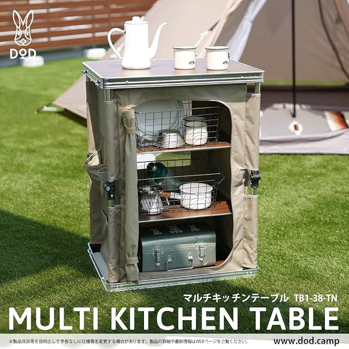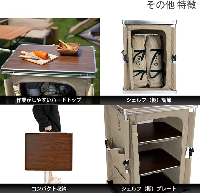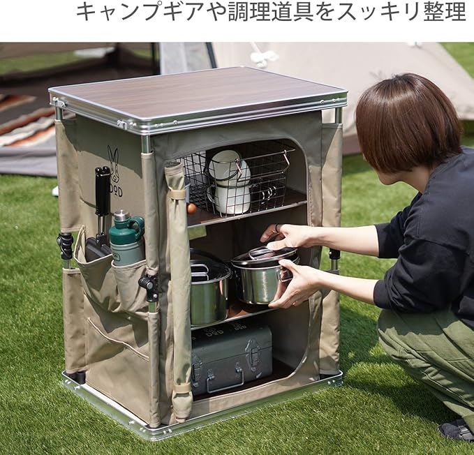キャンプサイトをすっきりおしゃれに整頓できる。ワンタッチで組み立てる大容量収納棚。