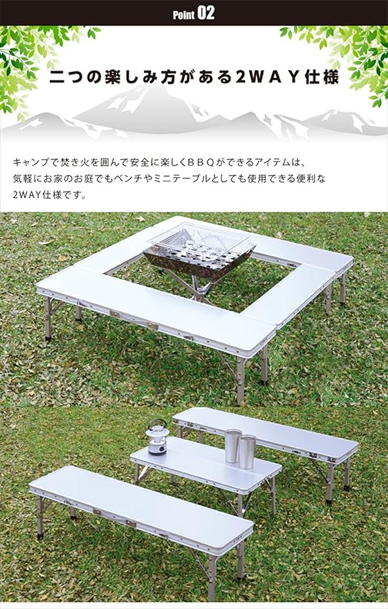 ●バーベキューテーブル・ベンチと2つの使用方法が楽しめる2WAY仕様。