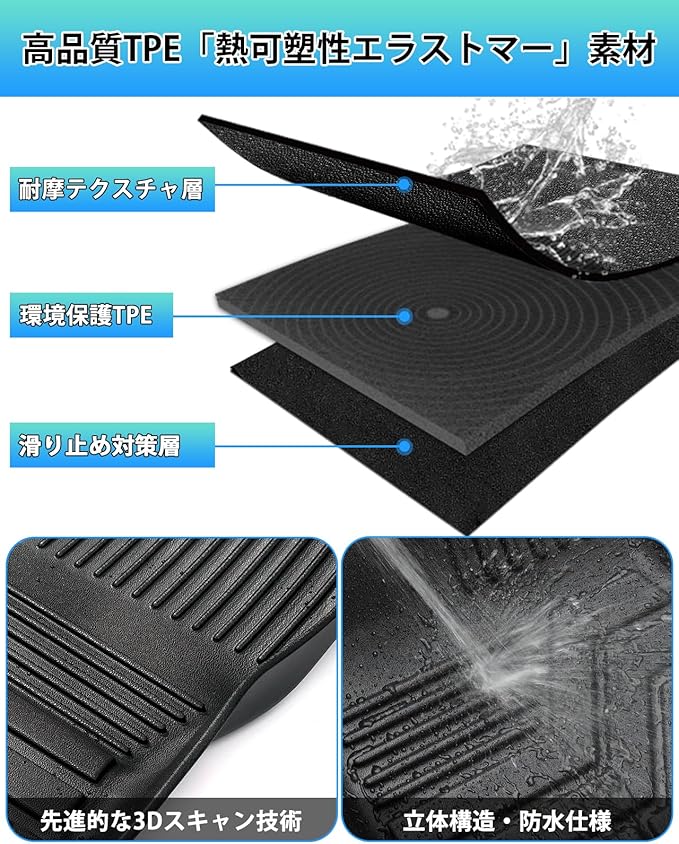 2.【高品質TPE素材】:摩擦性に優れたTPE樹脂素材を採用し、耐汚れと耐摩擦性を実現しました。3D立体構造のお掛けで車が運転している途中でも、飲み物などが溢れっても水やジュースなどはフロアマットの外への侵入を防止します。弊社のマットには防水性&耐摩擦性に優れた、変な匂いも無し、お手入れも楽々!