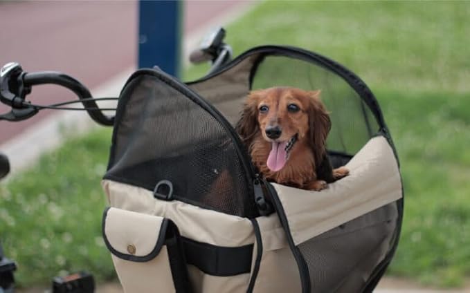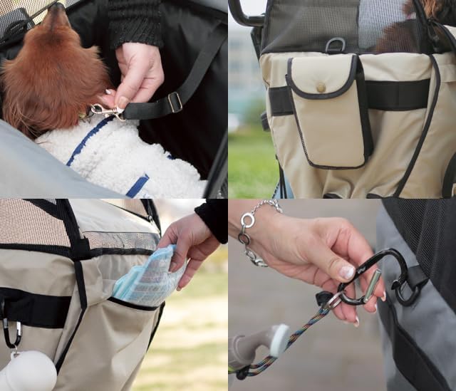 特徴 ・飛び出し防止ベルト ・カバーの外で持ち運びできるマナー袋ケース付き ・シーツなどを入れられる前ポケット ・小物をひっかけられるDカン付き ・大きな開口部で乗り降ろしラクラク ・通気性の高いメッシュ窓 ・フック3か所での簡単取り外し