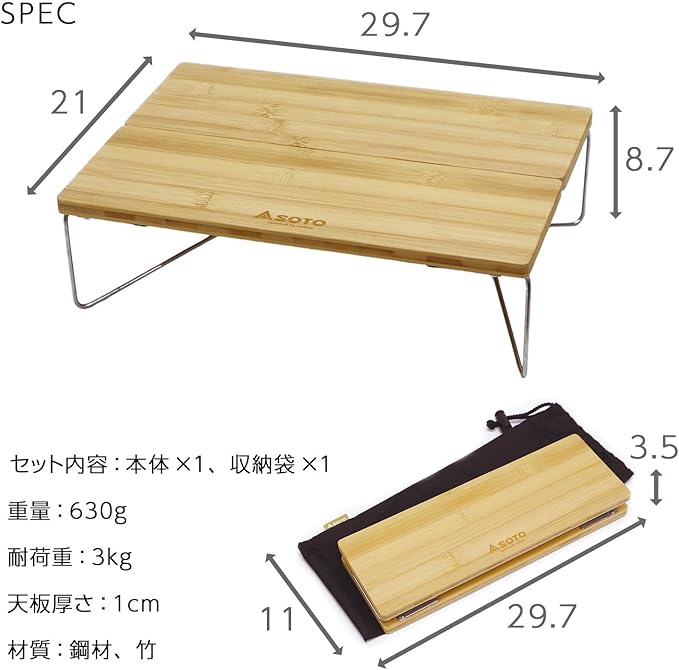 ●セット内容:本体 1、収納袋 1●本体サイズ(約):幅29.7 奥行21 高さ8.7cm(A4サイズ)●収納時サイズ(約):幅29.7 奥行11 高さ3.5cm●重量(約):630g●耐荷重(約):3kg●天板厚さ(約):1cm●材質:鋼材、竹