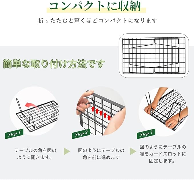 【アウトドアで大活躍】本製品はアウトドアでの飲み会やキャンプシーンに最適な多機能折りたたみテーブルです。食材の整理・収納機能を備えているだけでなく、耐熱性を活かしてバーベキューグリルとしてもご使用いただけます。コンパクトに折りたたむことができ、アウトドア活動の必需品として大活躍すること間違いありません。
