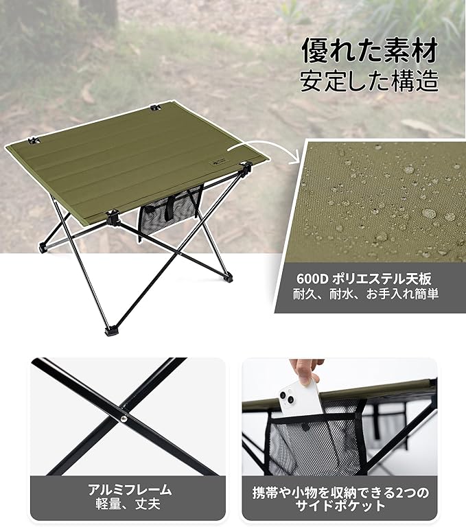 【耐久・長持ち】布製テーブルトップは600Dポリエステル生地で作られ、耐摩耗、破れにくい、変形しにくい、防カビ、防虫、耐久性が強い、アウトドアでの使用に適しています。耐汚性が強く、多くの汚れが浸透しにくく、吸湿性が低いので、洗濯してすぐに乾き、手入れが簡単