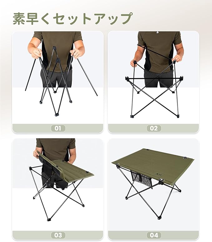 【使いやすい・素早く組立】組み立てが超簡単、数十秒で組み立てられ、初心者でも説明書なしで楽にセットアップできます。フレームは一体構造で、工具やネジを必要とせず、フレームを展開し、天板を固定してから、すぐに使い始めます