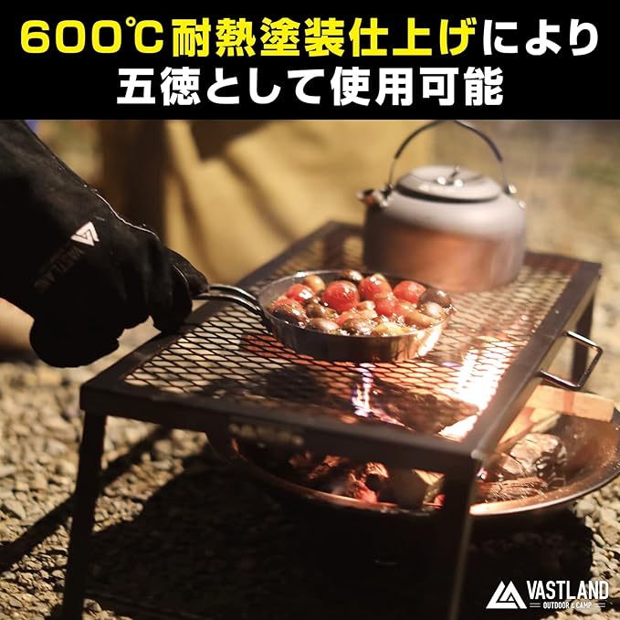 600℃の耐熱塗装を施しているため、直火での使用が可能です。焚き火の上で五徳として使用し、調理をお楽しみいただけます
