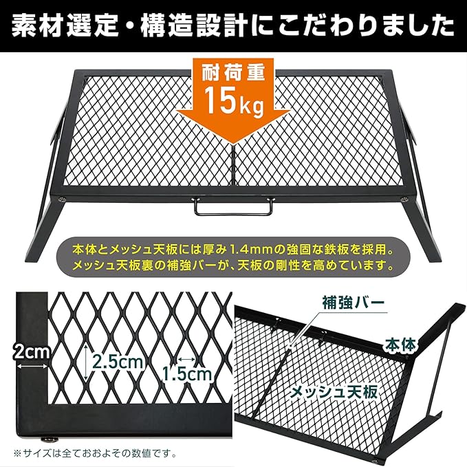 【耐荷重15kg】耐荷重の範囲内で、重い調理器具やクーラーボックスなどを設置できます 【こだわりの素材選定・構造設計】本体とメッシュ天板には厚み1.4㎜の強固な鉄版を採用。メッシュ天板裏の補強バーが、天板の剛性を高めています