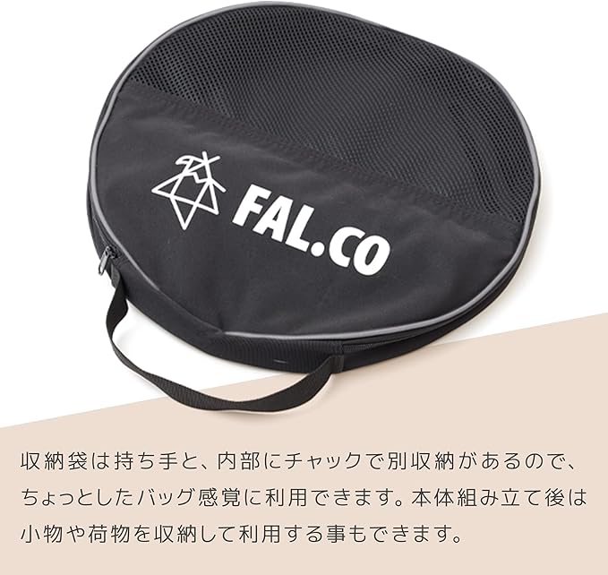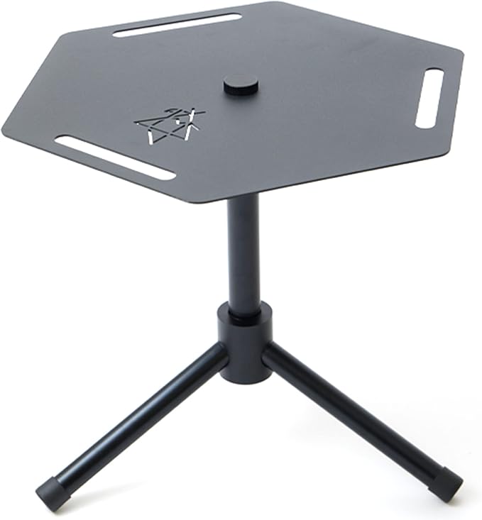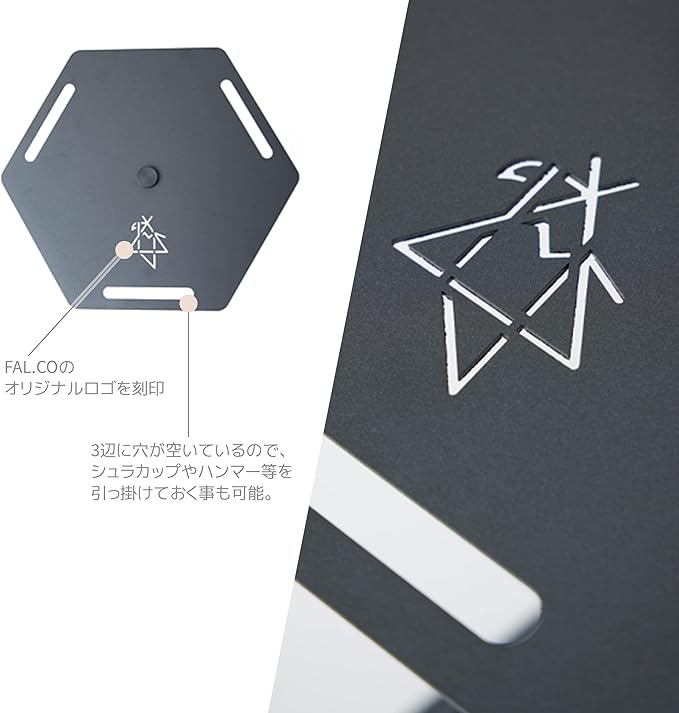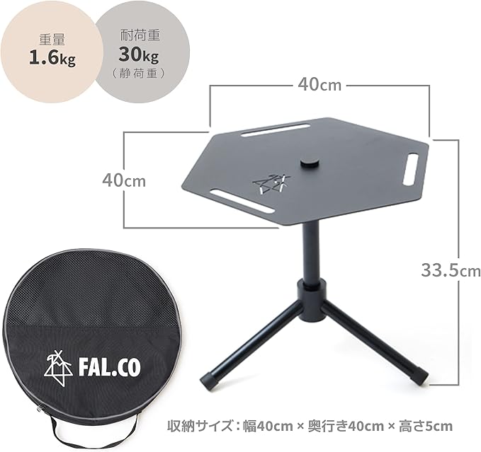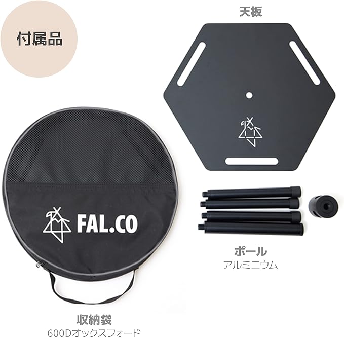 無骨でミニマル。洗練されたデザインを意識したFAL.COのヘキササイドテーブルです。 収納時は天板を外し、脚と支柱を外すことで円型の収納袋で薄く収納できます。 天板にはFAL.COのロゴマークを刻印し、3辺には穴を彫ることでシュラカップやちょっとした小物を引っ掛けられるようにしています。 もちろん、焚火の近くで利用も可能です。 キャンプチェアの横に置いておくと何かと便利ですし、ご自宅のベッドサイドでも活躍してくれます。 組み立て各ポールをねじ込むだけです。 脚のポール3本を支柱にねじ込み、支柱上部の蓋を外し、天板を取り付けて、蓋をねじ込むだけです。 <サイズ> (使用サイズ)長さ40 幅40 高さ33.5cm (収納サイズ)長さ40 幅40 高さ5cm (重量)1.6kg (耐荷重(静荷重))30kg <素材> 本体:アルミニウム 収納袋:600D Oxford 脚部分:アルミニウム <カラー> オールブラック 【まとめ】 ◆デザイン:オールブラックの天板はFAL.COのロゴ刻印で無骨ながらスタイリッシュに ◆軽量:わずか1.6kgでコンパクトに収納可能 ◆便利:天板の3辺に引っ掛け穴を設置 **商品画像は収納ケースの縁が黒くなっていますが、グレーに変更になりました。