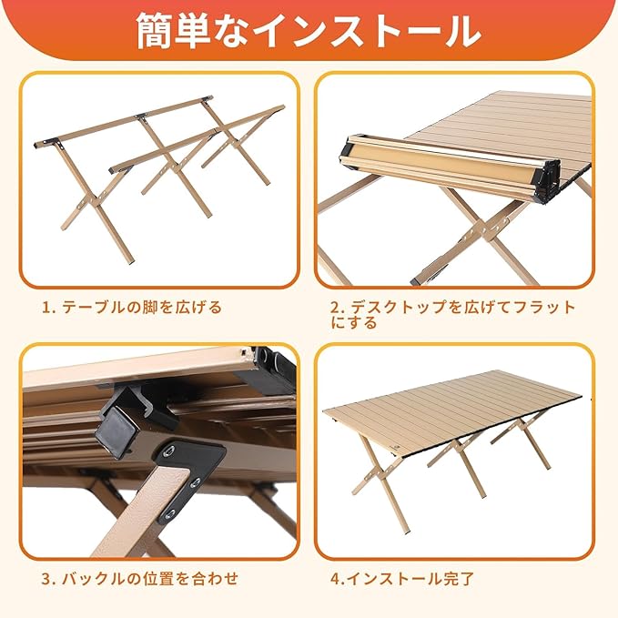 組み立て簡単で時間短縮:面倒な道具や手順は一切必要ありません。このキャンプテーブルは非常に簡単に組み立てられます。支柱を展開し、天板を置き、簡単な嵌め込み構造を使用して、素早く安定したテーブルを完成させることができます。これにより、屋外での活動中に瞬時にテーブルを設置し、食事や休憩を楽しむことができます。