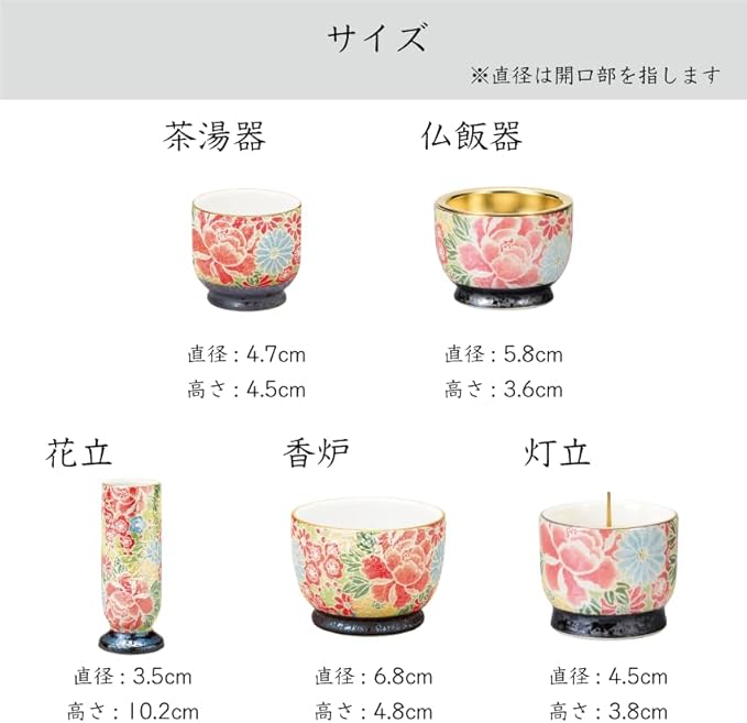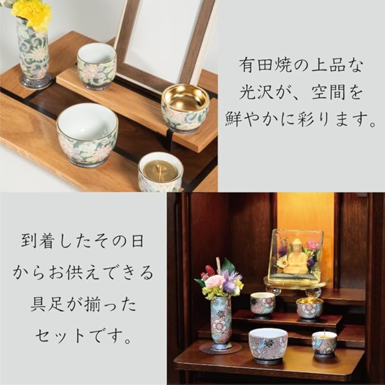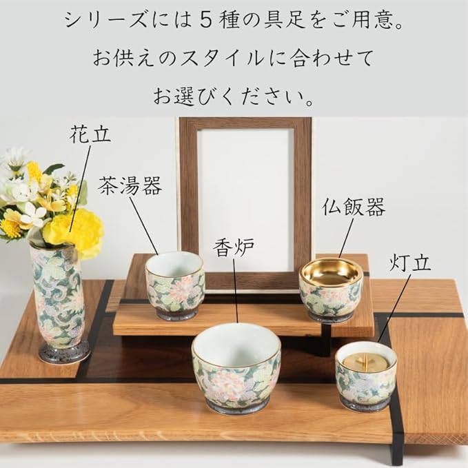 同シリーズ(仏飯器、湯呑、花瓶、燭台、香炉等仏具セット)の単品販売です。他シリーズのお香立てや線香差し、供物台、おりんと合わせての使用など、自由な組み合わせをお楽しみいただけます。