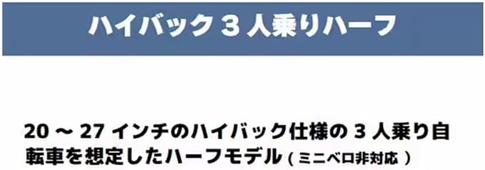 20~27インチのハイバック仕様の3人乗り自転車を想定したハーフモデルです(ミニベロ非対応)