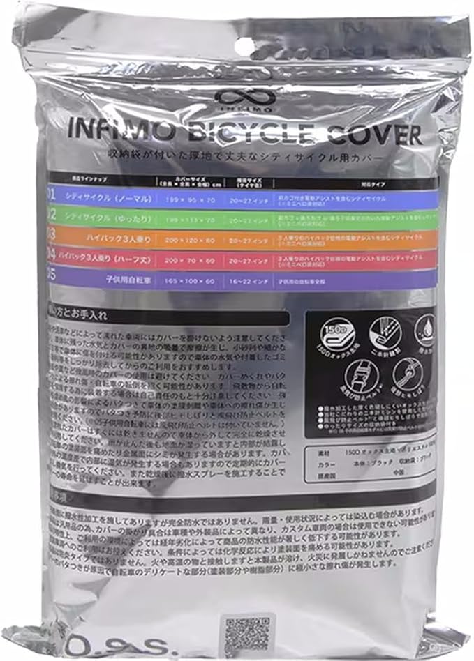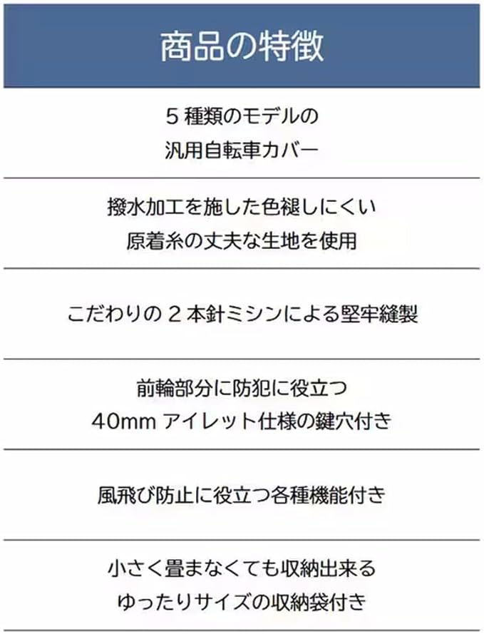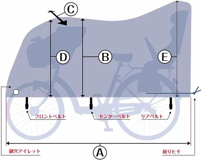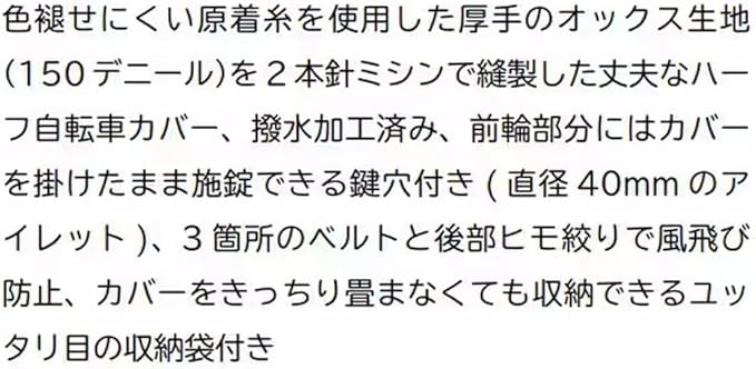 カバーサイズ全長 全高 全幅(mm): 2000 700 600 ハンドル部高さ(mm): 580 前方高さ(mm): 600 後方高さ(mm): 700