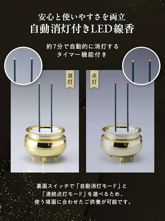 ✅自動消灯タイマー機能で消し忘れ防止 LED線香は約7分で自動的に消灯するタイマー機能を搭載しています。うっかり消し忘れても安心な設計で、高齢者や忙しい方にも最適。仏壇やリビングなどでの使用にも便利です。スイッチ操作で「自動消灯モード」と「連続点灯モード」の切り替えが可能となり、シーンに応じた使い分けができます。