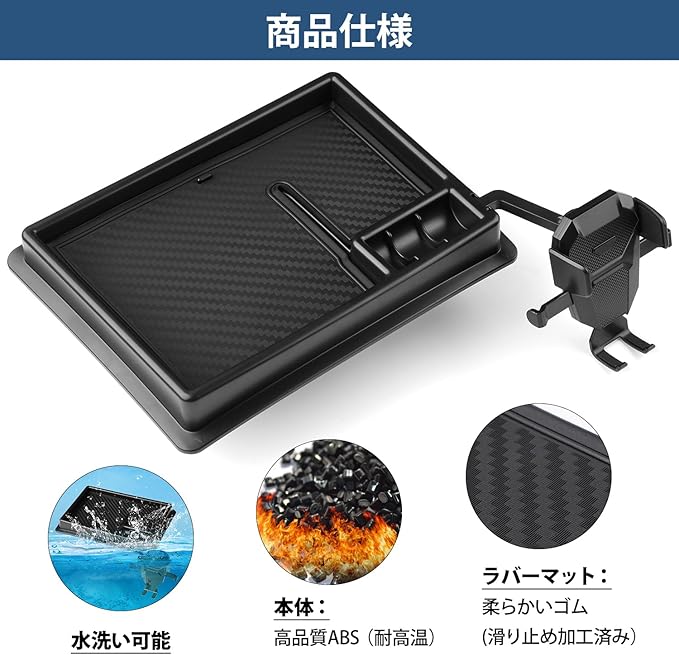 4.【素材】:本体:軽量かつ硬度が高いABS樹脂製 (耐高温) ラバーマット:環境にやさしいゴム(滑り止め加工済み)。運転中に小物があっちこっちに移動しにくくなり、フロントガラスへの反射も低減する効果が期待できます。【商品内容】:ダッシュボードトレイ本体*1、スマホホルダー*1、ボールジョイント*1、ゴムマット*1。