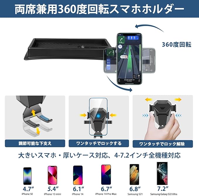 2.【360度回転スマホホルダー付き】:スマホ本体を固定する部分は360度回転でき、ロングアームでレバー等の干渉を避け、見やすい位置へ調整可能できます。