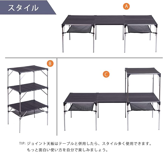 「2セット以上使えば、もっと多い使い方を楽しめます」別売りのジョイント天板とランタンスタンドは折りたたみテーブルとあわせて使用できます。※ ジョイント天板の並び順番をご注意ください。※