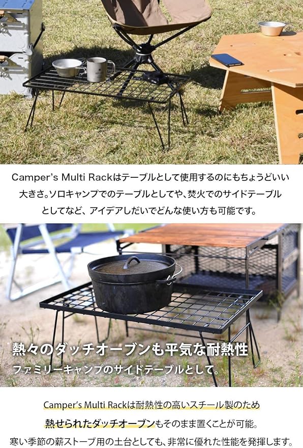 【1人用のテーブルとしても使用可能】マルチラックはテーブルとして使用するのにもちょうどいい大きさ。ソロキャンプでのテーブルとしてや、焚き火でのサイドテーブルとしてなど、アイデア次第でどんな使い方も可能です。 【熱々のダッチオーブンも平気な耐熱性】 ファミリーキャンプのサイドテーブルとして 耐熱性の高いスチール製を採用することにより、熱せられたダッチオーブンもそのまま置くことが可能に。 寒い季節の薪ストーブ用の土台としても、非常に優れた性能を発揮します。