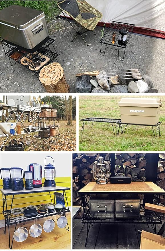 【散らかりやすいキャンプサイトのために】 サイトの雰囲気を邪魔しないデザインで、クーラーボックスや調理道具など、地面に置きづらいアイテムを 置く場所として最適。定位位置の決まりにくい荷物を地面に置くことなくキャンプサイトをスッキリ・おしゃれにすることができるアイテムです。
