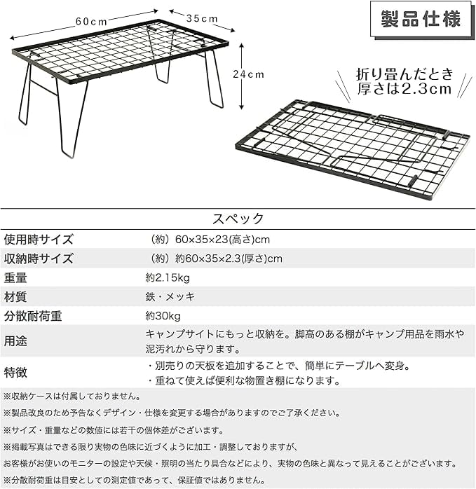 【製品サイズ】 (展開時)横(約)60cm x たて(約)35cm x 高さ(約)24cm (収納時)横(約)60cm x たて(約)35cm x 厚(約)2.5cm 本体重量:(約)2.1kg 耐荷重(分散耐荷重):30kg
