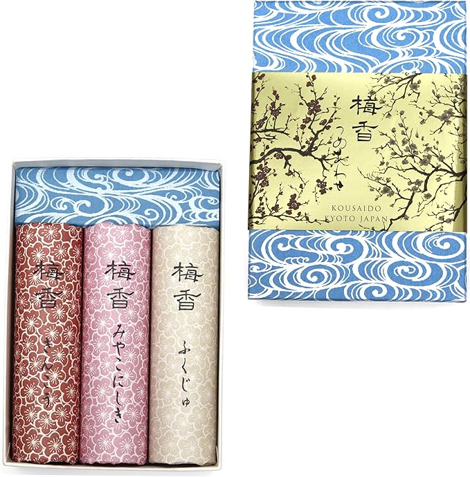 【本物を追求 線香マエストロによる調合】 長い歴史を誇る京都の線香は、受け継がれる伝統製法と厳格な品質管理により醸し出される品質と、海外産や大量生産では決して得られない、香りのマエストロ(職人)の技と誇りが融合し、心に深く響く香りを創り出します。【部屋が煙で充満しない少煙】 高貴な香りと漂わせつつ、煙の量を抑えた少煙タイプの線香は近隣に迷惑をかけず、屋外や室内の換気の難しい場所で使用する場面で最適です。【1本で約30平米、16畳に広がる香り。折って短時間で焚くことも可能です。】1本でも広い空間に香りが広がります。焚いたあともしばらく香り残ります。折って焚いたり、複数本を同時に焚いたり使い勝手が良いのも線香ならではの特徴です。【睡眠の改善、瞑想や集中力の向上】ローズやバニラなどに代表される甘美な香りは、安眠をサポートする助けになることがあります。就寝前に使用することで、リラックスした状態で眠りにつくことができます。白檀・サンダルウッドやフランキンセンスなどの香りは、瞑想や集中力を高める効果があるとされています。【仕様】寸法(外装)mm:約115 81 27(高) 内容量: 15本 4種 煙の量:少ない 燃焼時間:約15分 香り:梅をイメージした女性的な甘く華やかな3種の香り 素材:みやこにしき(タブ粉・バニラ、龍脳等) きんこう(タブ粉・イランイラン、麝香系、龍脳等) ふくじゅ(タブ粉・メントール、レモン、ベルガモット等) 製造国:京都