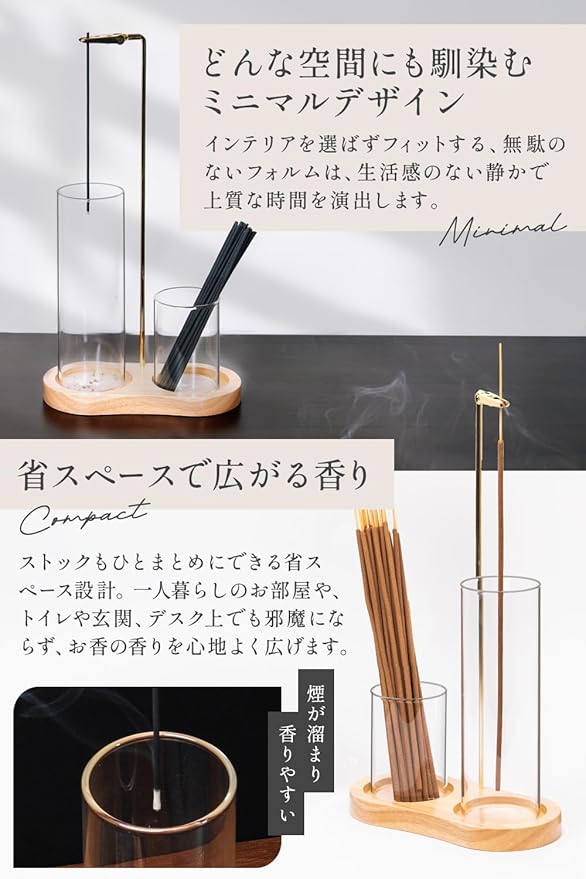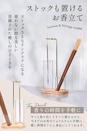 お香の収納から香りを楽しむまで、これ1つで完結するオールインワンのお香立てです。サッと手に取って火をつけられるので、癒しのひとときをすぐに始められます。縦型で場所を取らないので、玄関やトイレ、店舗などの限られたスペースでもお香をお楽しみいただけます。シーンを選ばないシンプルなデザインなので、どんな雰囲気のお部屋にも馴染みます。お香を支える部分にはクリップを採用しており、お香が倒れる心配はありません。また、クリップを採用することで、スティック型のあらゆるお香に対応しており、すでにお持ちのお香も問題なくお楽しみいただけます。横型のお香立てと比べて受け皿に高さがあるので、灰が散らかる心配はありません。ガラス製の受け皿を採用する事で水洗いが可能となり、衛生的でお手入れが簡単です。デザイン性と機能性を兼ね備えたオールインワンのこちらのお香立てが、お客様の生活の中でお役に立つ日が来ることを心からお待ちしております。