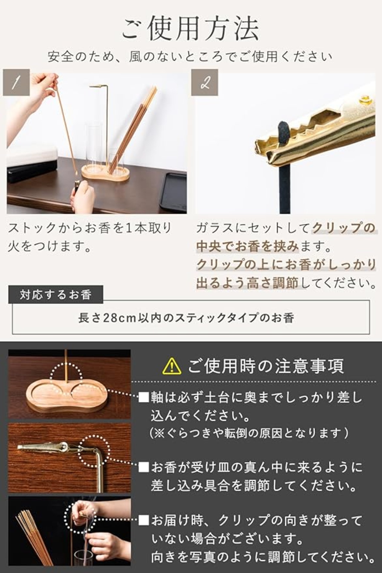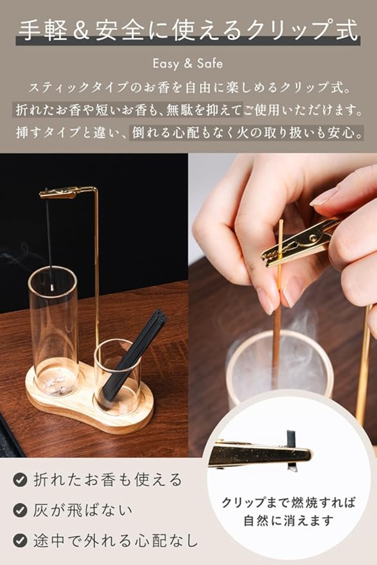 【多様なスティック香にフィットする安心設計】スティック型のお香であれば、ほぼすべての種類に対応しております。全長28cmのロングサイズにも対応しており、クリップで挟むので太さの違いにも柔軟に対応できる設計となっております。既にお持ちのお香も幅広くお楽しみいただけます。