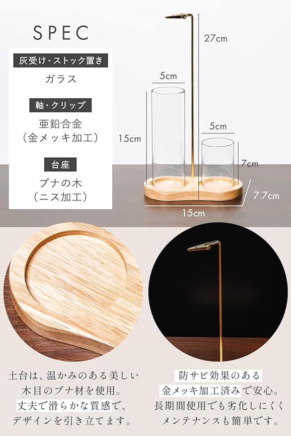 【商品概要】サイズ:高さ27 幅15 奥行き7.7cm 重さ:400g クリップ:亜鉛合金 受け皿:ガラス 土台:ブナの木