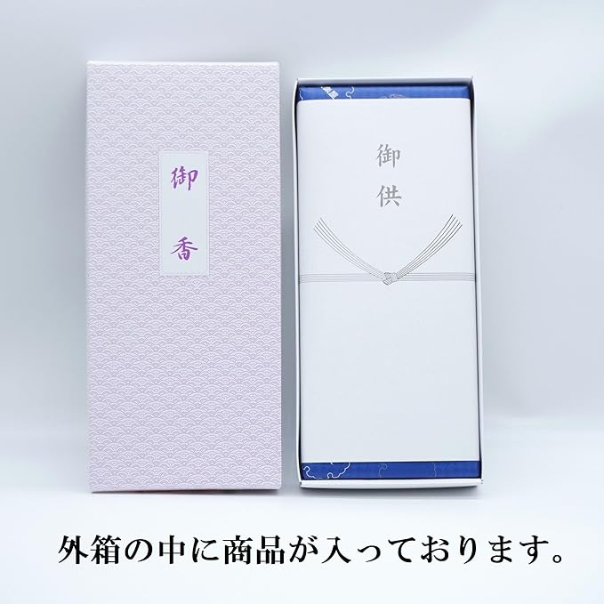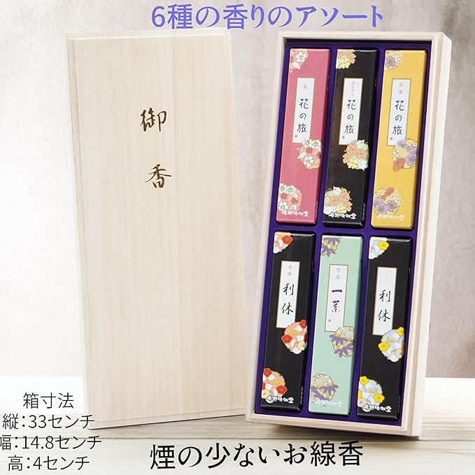 このお線香セットは、上品な桐箱に収められており、贈り物にも最適です。香りは桜、紅梅、竹炭、椿赤、椿黄、花水木の6種類が揃い、それぞれ異なる香りで、リラックスしたひとときをお楽しみいただけます。1箱には40本のお線香が入っており、煙が少ないため、お部屋の空気をこもらせることなく、心地よい香りを広げます。さらに、御供熨斗が付けられており、丁寧に包装されているため、大切な方への贈り物にも安心してお使いいただけます。