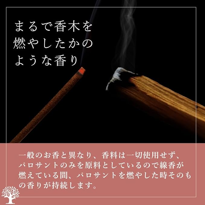 ずっと続くパロサントの香り。パロサントの香木を燃やしてもすぐに煙が消えてしまうといったことありませんか?そんなお悩みを解消してくれるのが本商品!お香、スティックタイプなので最後まで、ゆっくりと香りを楽しめます。