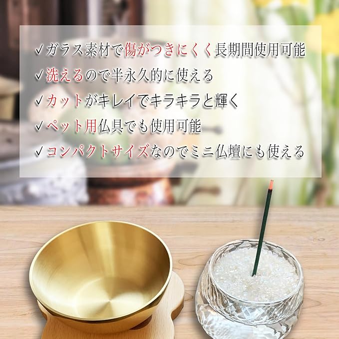 【製品概要】この香炉は、伝統的な仏具のデザインに現代的なクリスタルガラスの輝きを取り入れた美しいアイテムです。お香立てとして、日常のリラックスタイムや瞑想に最適で、ミニ仏壇にもぴったりのサイズ感です。クリスタルガラスの輝きが特徴で、女性の手でも片手に収まるコンパクトなサイズとなっています。また、50gのガラスチップが付属しており、香炉灰の代わりとして使用できます。