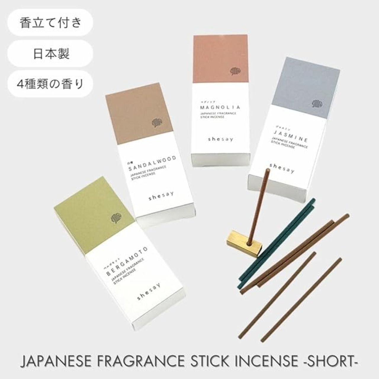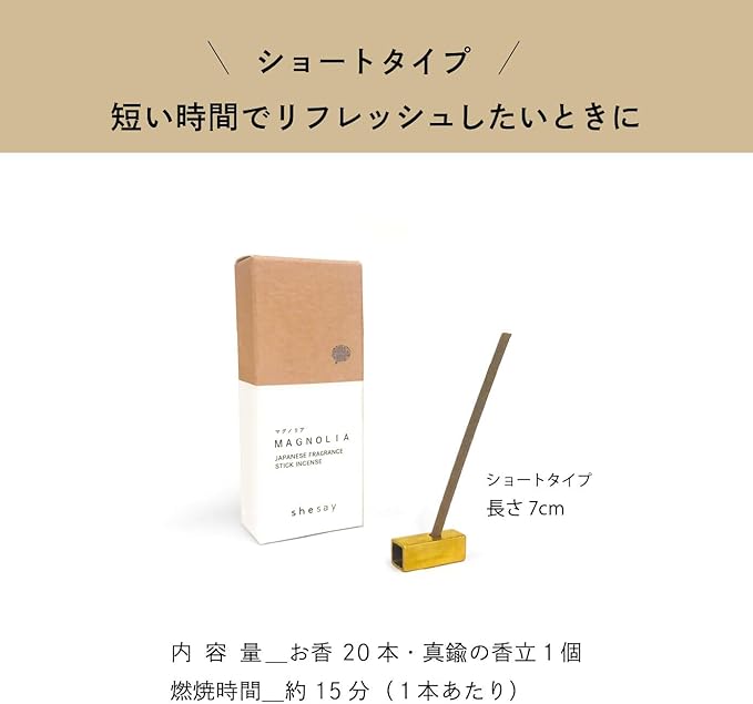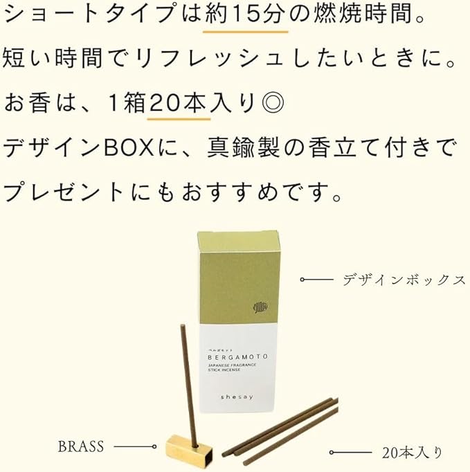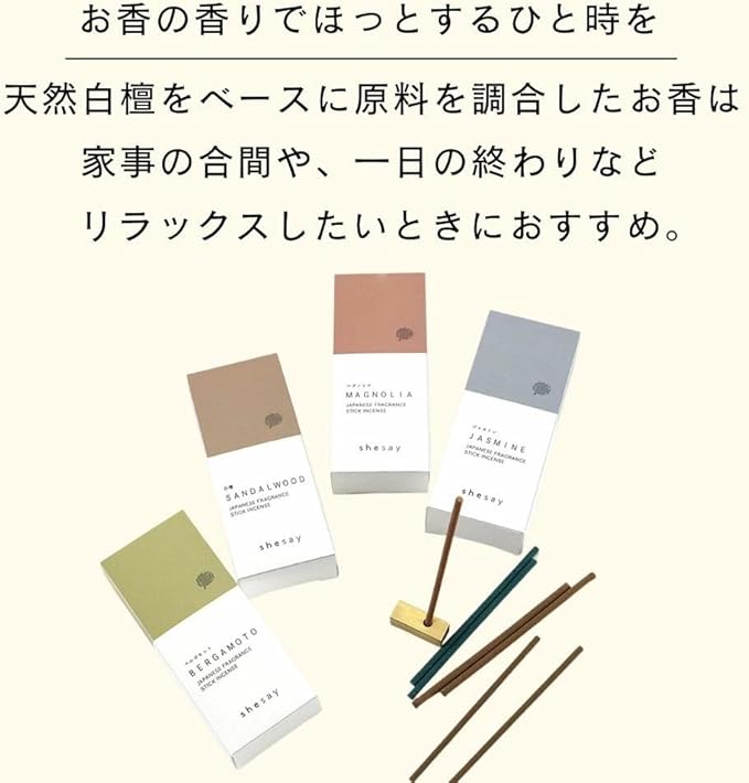 - 天然白檀をベースにした上質な日本製のお香 - 短時間で楽しめるショートタイプ(約15分燃焼) - シンプルなデザインのギフトBOX入りでプレゼントにも最適 - 真鍮製お香立て付きですぐに使用可能 - shesayオリジナルハンドバッグ付きで持ち運びにも便利
