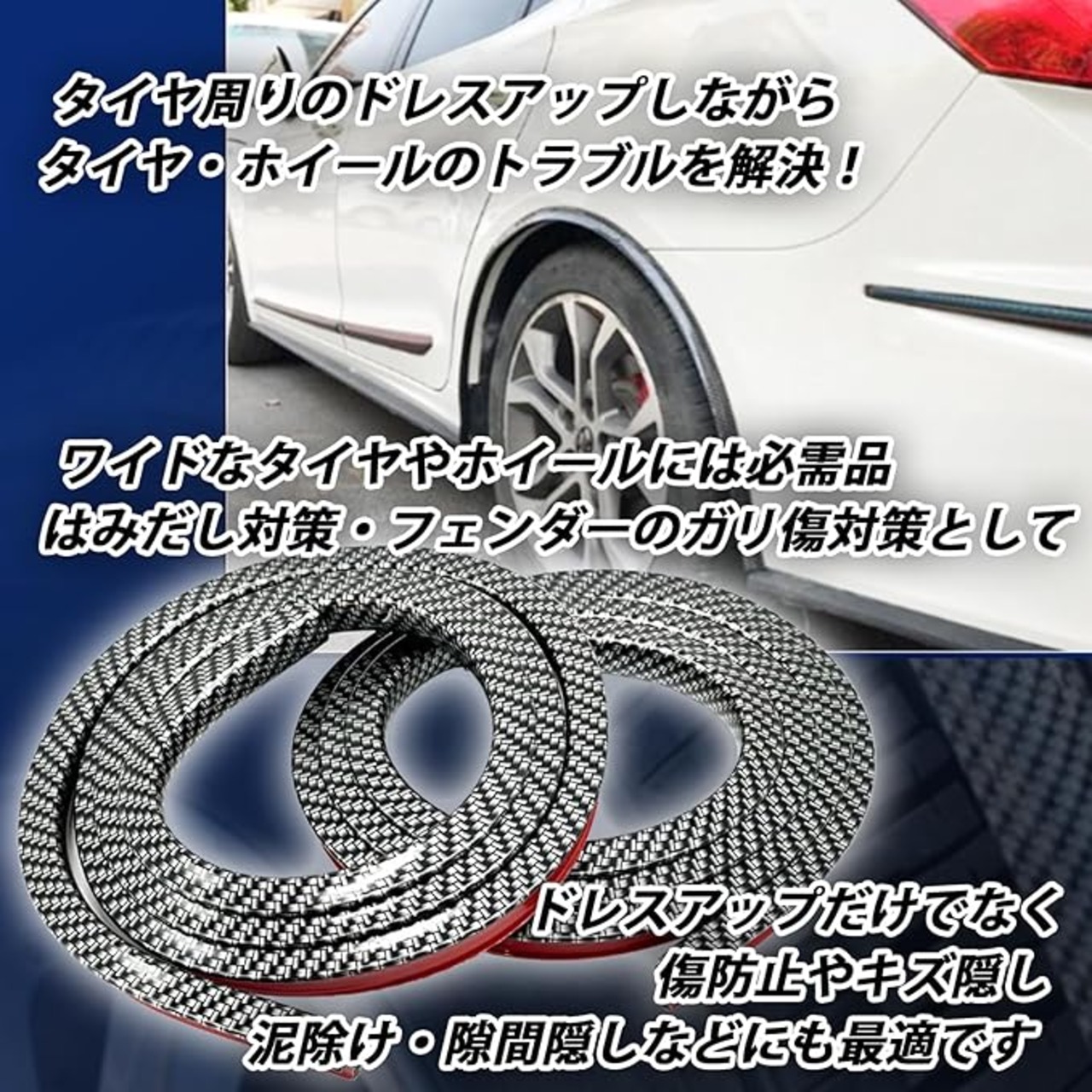 ワイドなタイヤやホイールには必需品。はみだし対策、フェンダーのガリ傷対策としてお使いいただけます。 ※必ず汚れを拭き取って脱脂してからお取り付けください。