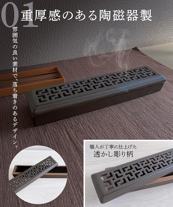 この陶磁器製の線香ケースは、重厚感あるデザインと美しい透かし彫りが特徴です。リラックス効果と空気浄化に役立ち、防火シート付きで安全。リビングや書斎など多様な場所で利用できます。