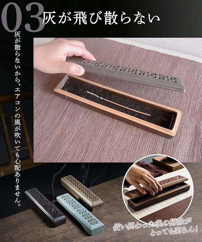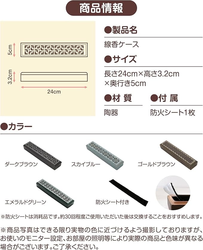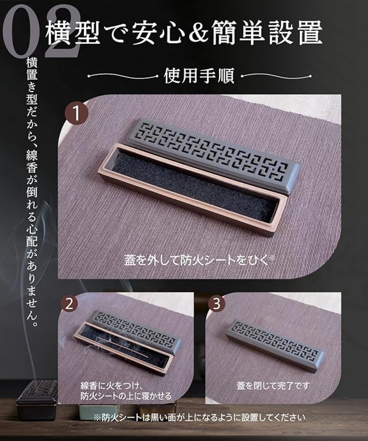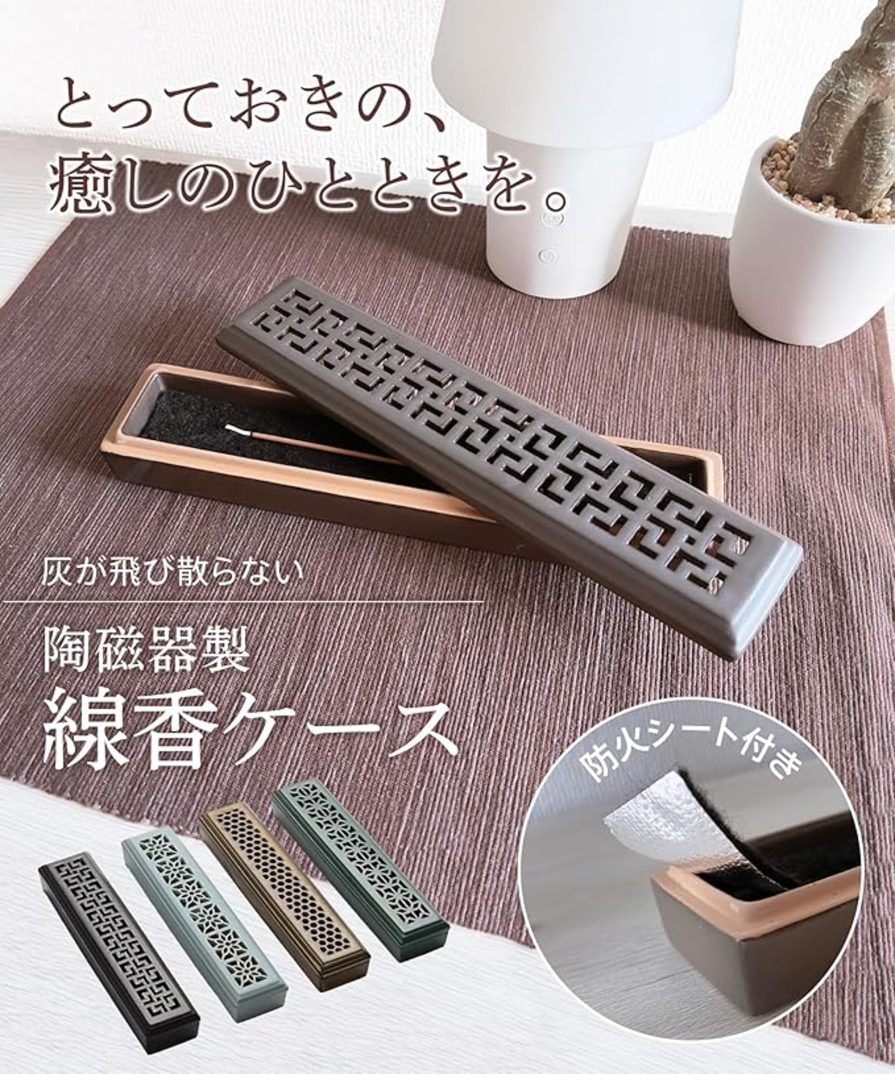 【安心の防火シート付きで安全】この線香ケースには、防火シートが付属しており、火災の心配なく安全に使用できます。また、線香の香りが長時間持続するため、安心して香りを楽しむことができます。