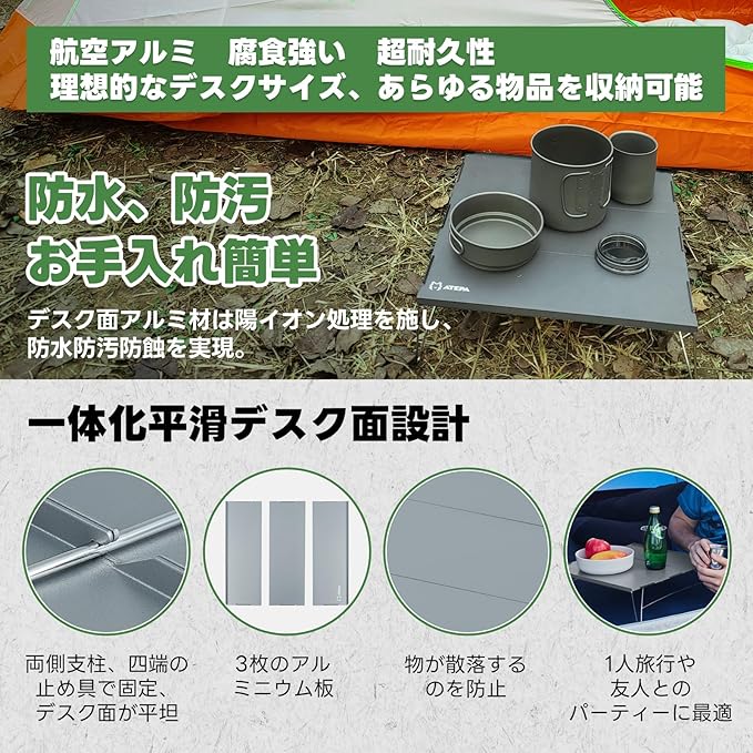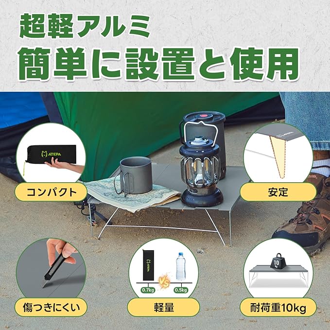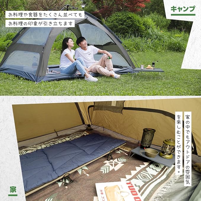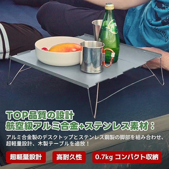 【幅広いアウトドアシーンで活躍】 テント内のサブテーブル、ソロキャンプのコーヒースタンド、バックパッカーの軽量装備など、幅広いアウトドアスタイルに対応アルミテーブル キャンプです。ピクニックや花見にもぴったりです。