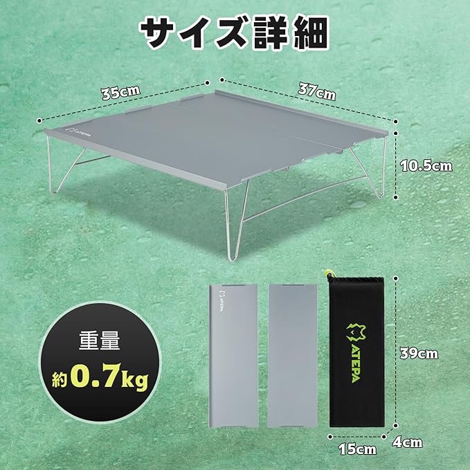 【超軽量&コンパクト】 キャンプ テーブル コンパクトの総重量わずか0.7kg、収納時はわずか39 15 4cm。ザックやバイクバッグにもすっぽり収まるサイズ感で、ソロキャンプ・登山・釣りなど荷物を軽くしたいアウトドアシーンに最適。