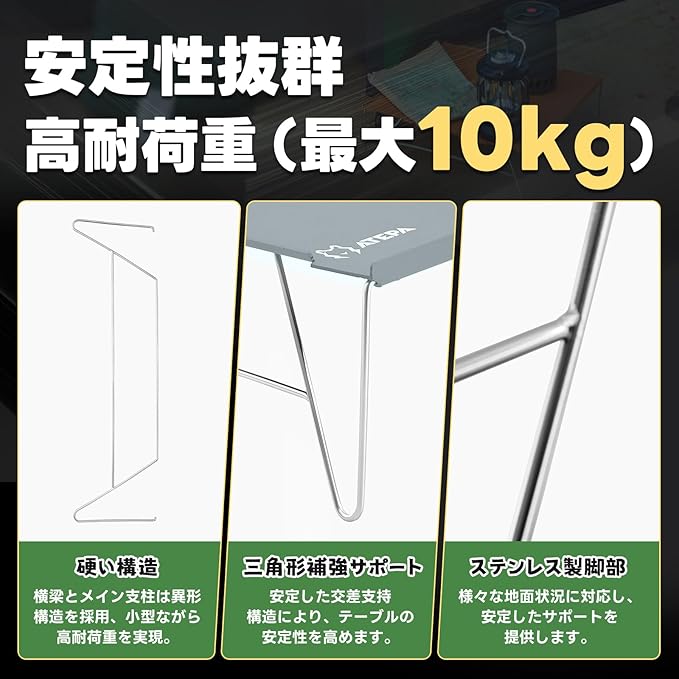 【全アルミ合金製テーブル天板】 アルミテのーブルの高品質6063アルミ合金素材を使用。耐腐食・防水・耐熱性に優れ、焚き火のそばや湿気の多い場所でも安心して使えます。キャンプ テーブル 軽量の表面はパウダーコーティング加工で美しく耐久性抜群。キャンプ ミニテーブルの脚部には304ステンレスを採用し、安定性と耐荷重性(最大10kg)を両立。