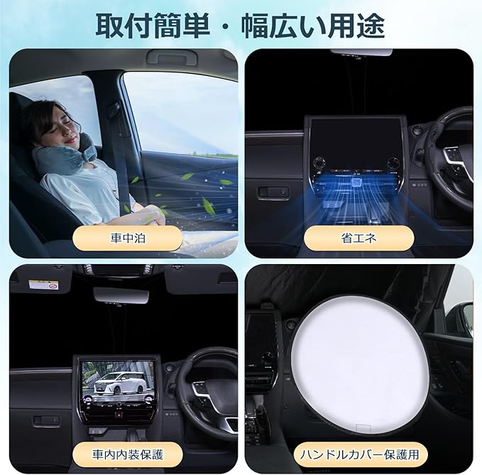 3.【多機能】:アルミ遮熱シートの眩しい光線を抑えることができます。他人に迷惑を掛けないし、プライバシーも保護できます。また、夏の日は熱線を遮断し、車内温度を抑えて、冬の日は車内の熱を外から逃がさない為、暖房効果があります。【ストラップ&収納袋付き】:本製品はストラップを設計し、収納する場合、ストラップで収納できます。また、収納袋も改良され、ハンドルカバーに置く可能です。