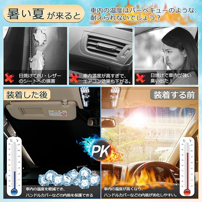 2.【4層構造】:1層目:高品質高密度アルミ遮熱シート、2層目:ポリウレタン断熱素材、3層目:高品質高密度アルミ遮熱シート、4層目:ポリウレタン断熱素材。高い断熱効果がある素材によって、夏の日で強い日差しを遮断して、車内の温度を減ります。また、紫外線を効果的にカット出来ます。冬の日で窓からの冷気の浸入を防ぎ、車内温度をキープして車中泊も快適です。エアコンの効率を良くするので省エネになります。従来品よりも遮光性や保温性を大幅にアップし、夏の日を温度下げて、冬の日を温度を上げる効果があります。エアコンの効率を良くするので省エネになります。ブラックメッシュ仕上げ。✔注意:他社の製品の外観は本社と同じく、でも相手は5層などを宣伝していますが、実際には本社と同じく2層構造です。✔本物の5層は厚くて使用不便、特に頻繁使用の場合、実用性はゼロになります。
