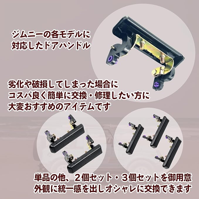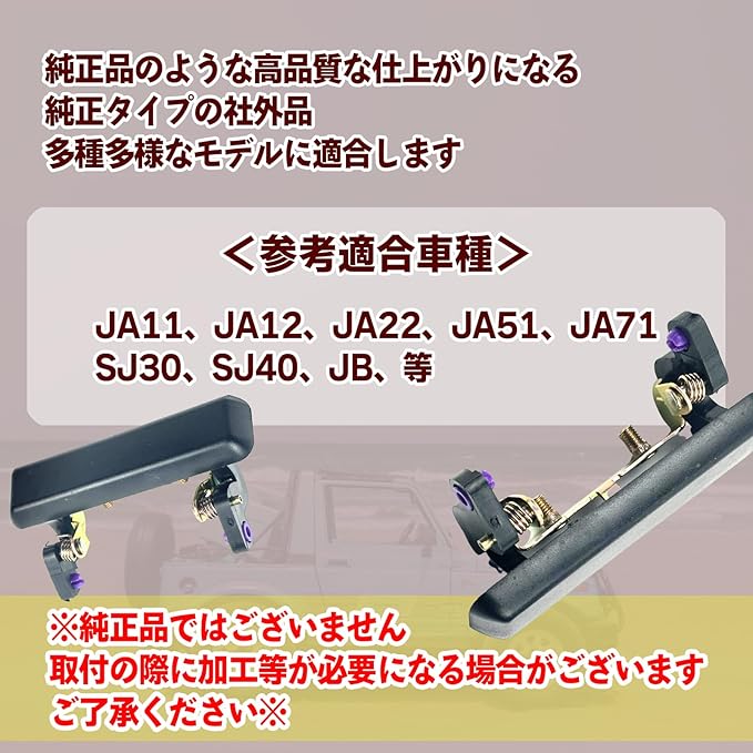 【適合車種豊富】ジムニーの各モデルに対応したドアハンドルです。JA11、JA12、JA22、JA51、JA71、SJ30、SJ40、JBといった多種多様なモデルに適合します。あなたの愛車にぴったりのドアハンドルを提供します。