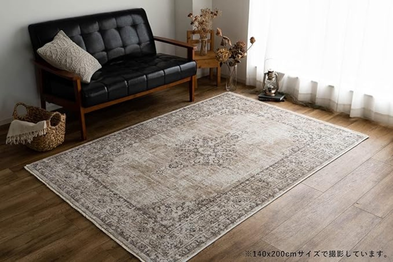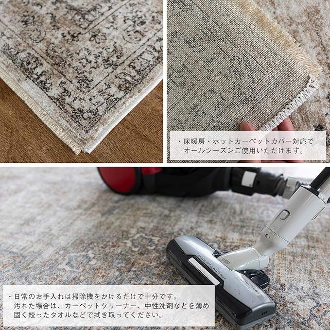 【輸入カーペットを安心してご利用いただくためのお願い】 ●輸入ラグに関して ※同じ商品でも製造ロットの違いによって、サイズや、色味、柄模様の左右が反転していたり、位置がズレている場合がございます。ただし、現地の工場や倉庫での検品をクリアした商品を輸入しています。あらかじめご了承くださいませ。/ ●においに関して ※ご使用当初、裏面に塗られる仕上げの接着塗料(ラテックス剤)のにおいがする場合がございます。人体への影響はありませんが、においに敏感の方や、ご心配の方はご理解の上ご購入お願いいたします。開封後常温のもとで気化(蒸発)するため、においはご使用につれてなくなります。気になる場合は風通しの良いところで陰干ししていただきますと、より早く解消されます。/ ●サイズに関して ※カーペットの製法上、表示サイズより0~3%の誤差がございます。/ ※いずれも商品の初期不良ではございませんので返品・交換は行なっておりません。(※お客様で返品の送料ご負担によるキャンセルは、返品規定に基づきお受けさせていただきます。)/ ※裏面に製品シールが貼っている場合は剥がさないでご使用ください。