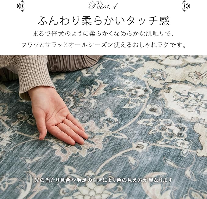なめらかなフランネル生地に、小さな模様やかすれ感を細部までプリントで表現した、まるで高級絨毯のようなデザインの一枚。毛足が短く、さらさらした肌触りの良い感触です。自宅で洗えるので汚れても安心。いつでも清潔にお使いいただけます。