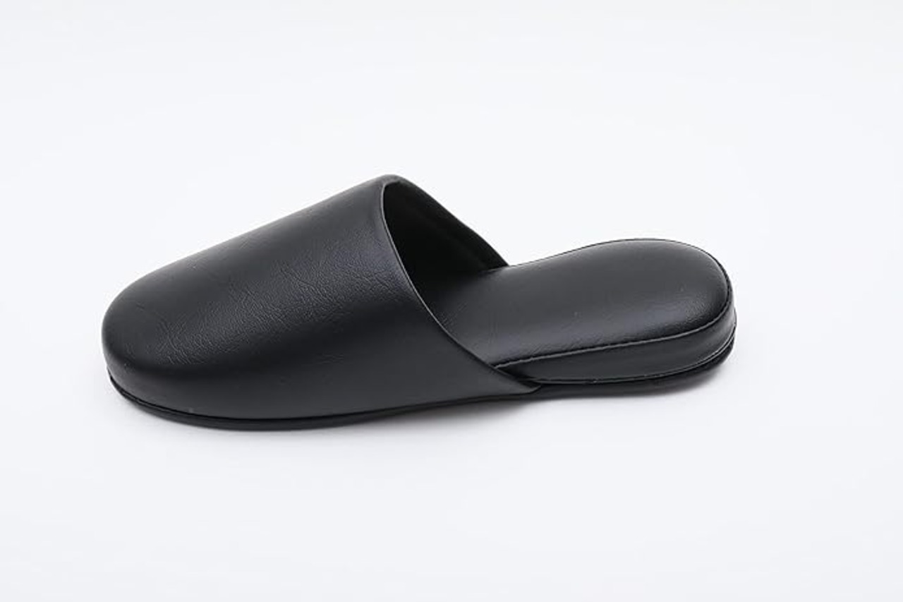 職人さんが工夫を重ねた日本伝統技術を用いた吊り込みタイプのレザー調スリッパ。しっかりとした作りの高級感あるレザータッチモデルです。耐久性にも優れています。また、甲裏はポリエステル生地なので足を入れてもヒヤッとせず、脱げにくいです。