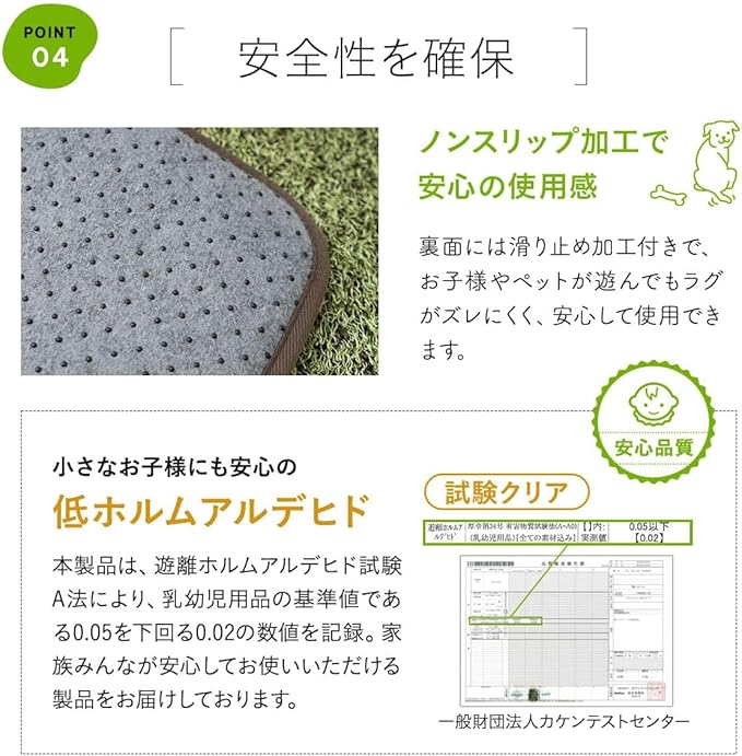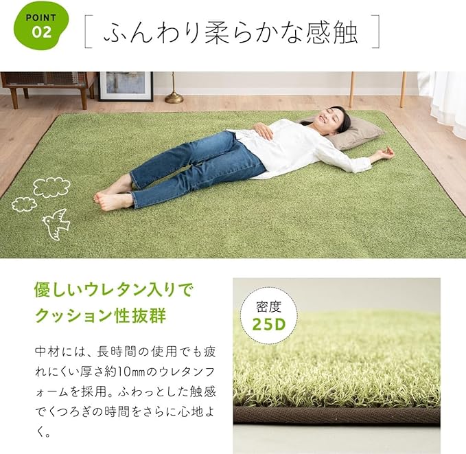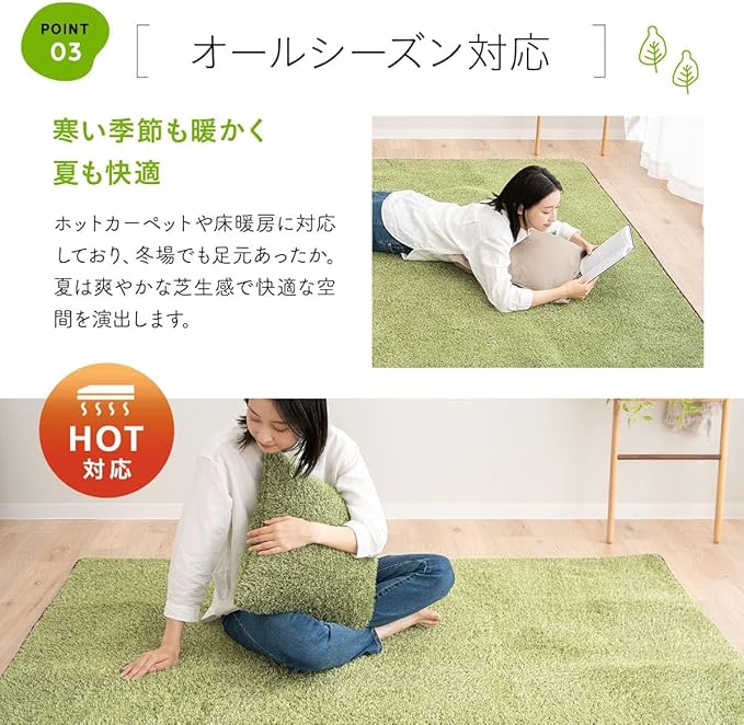 ホットカーペットや床暖房に対応。夏は爽やかな芝生感で快適な空間を演出します。裏面にはラグのズレを防ぐ、滑り止め加工を施しました。